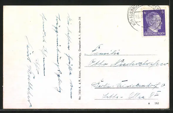 Personenbezogene Daten auf der Rückseite der Karte wurden durch blauen Textmarker unkenntlich gemacht. Die blauen Stellen sind auf die Vorderseite durchgeweicht und wirken sich negativ auf das Postkartenfoto aus