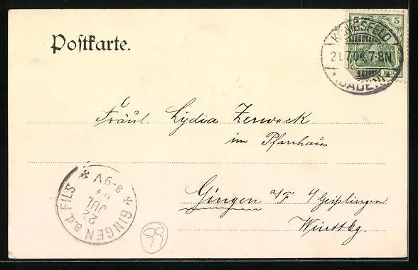 gelaufen 1904, Briefmarke tw. entfernt, guter Zustand