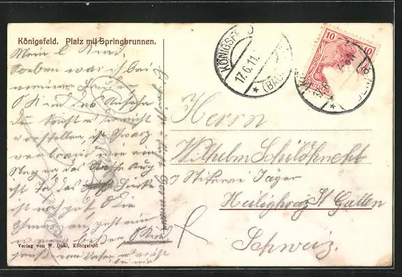 gelaufen 1911, Briefmarke tw. entfernt, rückseitig Oberflächenschaden, vorderseitig Klebe- und Papierreste, guter Zustand