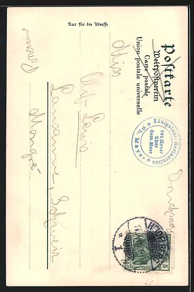 Personenbezogene Daten auf der Rückseite der Karte wurden durch blauen Textmarker unkenntlich gemacht. Die blauen Stellen sind auf die Vorderseite durchgeweicht und wirken sich negativ auf das Postkartenfoto aus