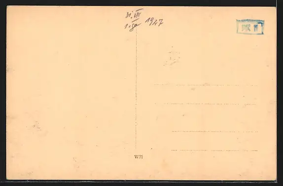 Personenbezogene Daten auf der Rückseite der Karte wurden durch blauen Textmarker unkenntlich gemacht. Die blauen Stellen sind auf die Vorderseite durchgeweicht und wirken sich negativ auf das Postkartenfoto aus