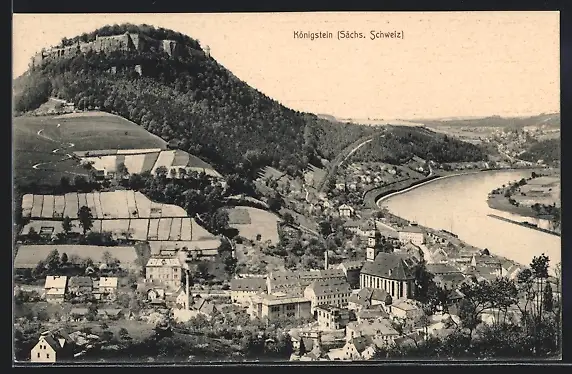 AK Königstein (Sächs Schweiz), Ortsansicht mit Feldern und Festung