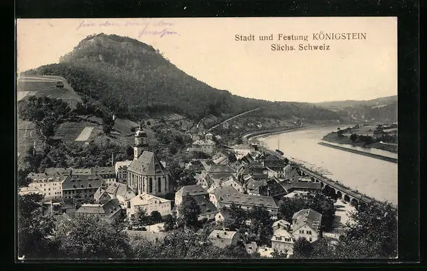 AK Königstein /Sächs. Schweiz, Ortsansicht mit Kirche und Fluss