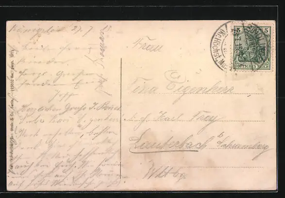 Personenbezogene Daten auf der Rückseite der Karte wurden durch blauen Textmarker unkenntlich gemacht. Die blauen Stellen sind auf die Vorderseite durchgeweicht und wirken sich negativ auf das Postkartenfoto aus