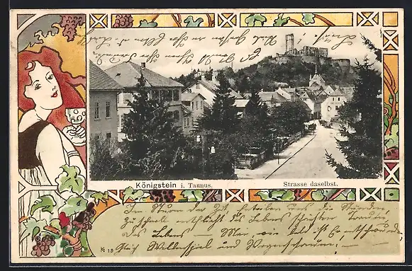 AK Königstein i. Taunus, Strasse daselbst, Frau hält Weinglas, Passepartout