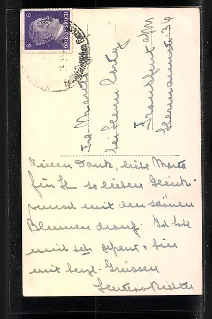 Personenbezogene Daten auf der Rückseite der Karte wurden durch blauen Textmarker unkenntlich gemacht. Die blauen Stellen sind auf die Vorderseite durchgeweicht und wirken sich negativ auf das Postkartenfoto aus