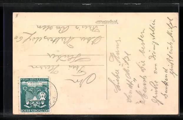 Personenbezogene Daten auf der Rückseite der Karte wurden durch blauen Textmarker unkenntlich gemacht. Die blauen Stellen sind auf die Vorderseite durchgeweicht und wirken sich negativ auf das Postkartenfoto aus