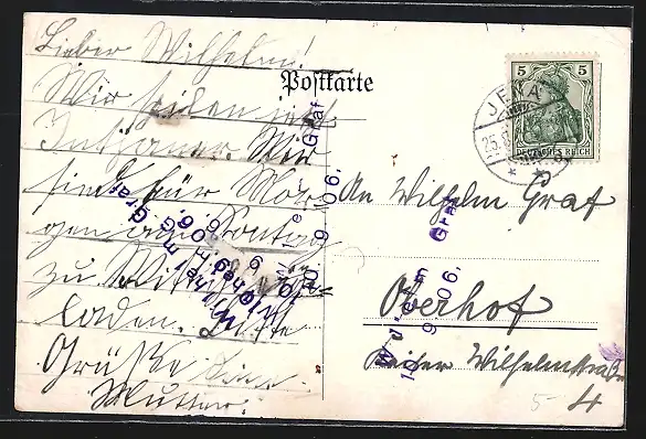 gelaufen 1906, Eckknicke links u. rechts, Abriebspur re. unten, leicht fleckig, guter Zustand