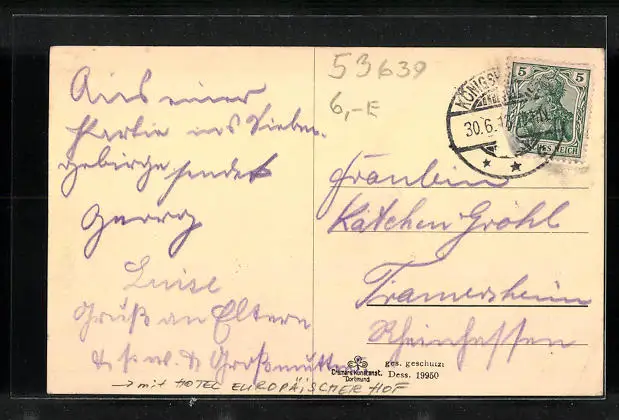 Personenbezogene Daten auf der Rückseite der Karte wurden durch blauen Textmarker unkenntlich gemacht. Die blauen Stellen sind auf die Vorderseite durchgeweicht und wirken sich negativ auf das Postkartenfoto aus