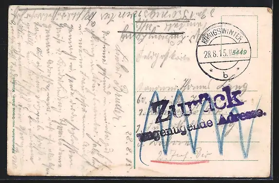 Personenbezogene Daten auf der Rückseite der Karte wurden durch blauen Textmarker unkenntlich gemacht. Die blauen Stellen sind auf die Vorderseite durchgeweicht und wirken sich negativ auf das Postkartenfoto aus