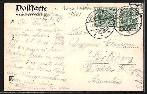 alte Ansichtskarte, gelaufen 1908, Eckknick li. unten, guter Zustand