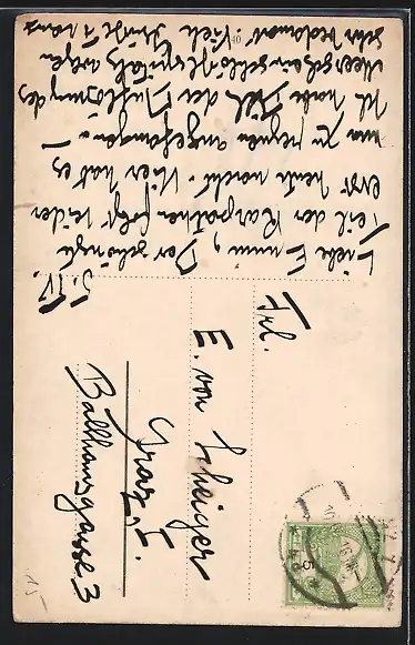 Personenbezogene Daten auf der Rückseite der Karte wurden durch blauen Textmarker unkenntlich gemacht. Die blauen Stellen sind auf die Vorderseite durchgeweicht und wirken sich negativ auf das Postkartenfoto aus
