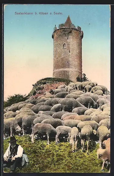 AK Kösen a. Saale, Schafherde vor dem Saaleckturm