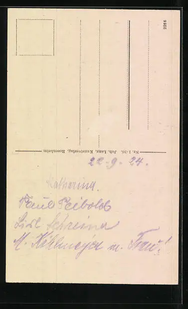 Personenbezogene Daten auf der Rückseite der Karte wurden durch blauen Textmarker unkenntlich gemacht. Die blauen Stellen sind auf die Vorderseite durchgeweicht und wirken sich negativ auf das Postkartenfoto aus