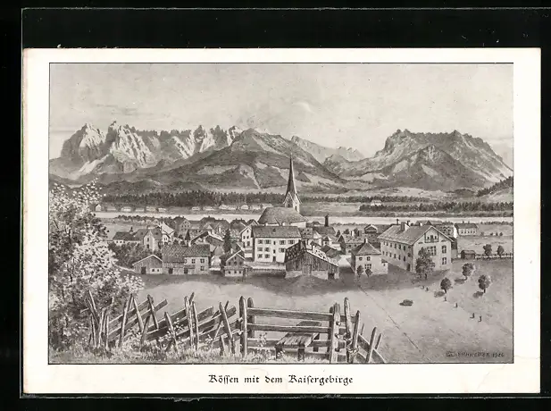 AK Kössen, Ortsansicht mit Kaisergebirge