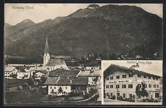 AK Kössen /Tirol, Gasthof Neue Post, Teilansicht mit Kirche
