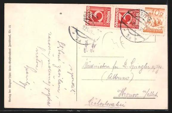 gelaufen 1925, Briefmarke entfernt, Eckbug rechts oben, guter Zustand