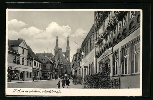 AK Köthen /Anhalt, Partie in der Marktstrasse mit Blick auf Kirche
