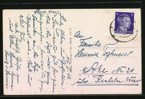 alte Ansichtskarte, gelaufen 1943, Bugspuren li. oben u. re. unten, guter Zustand