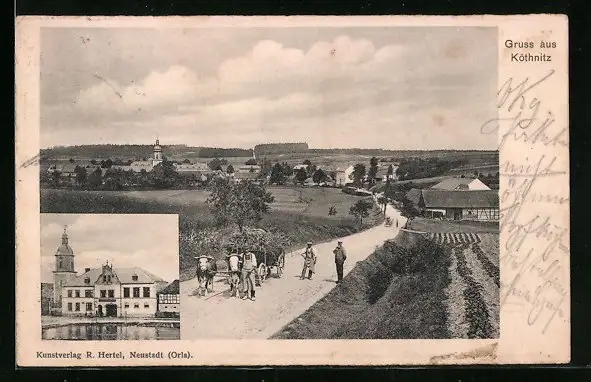 AK Köthnitz, Totalansicht, Bauer mit Ochsenkarren