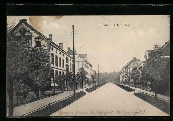 Personenbezogene Daten auf der Rückseite der Karte wurden durch blauen Textmarker unkenntlich gemacht. Die blauen Stellen sind auf die Vorderseite durchgeweicht und wirken sich negativ auf das Postkartenfoto aus
