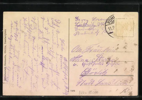 Personenbezogene Daten auf der Rückseite der Karte wurden durch blauen Textmarker unkenntlich gemacht. Die blauen Stellen sind auf die Vorderseite durchgeweicht und wirken sich negativ auf das Postkartenfoto aus