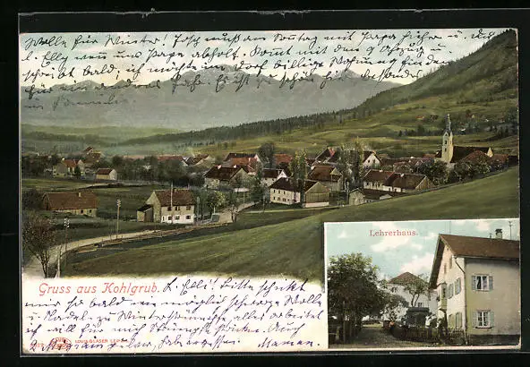 AK Kohlgrub, Ortsansicht aus der Vogelschau, Lehrerhaus