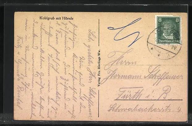 Personenbezogene Daten auf der Rückseite der Karte wurden durch blauen Textmarker unkenntlich gemacht. Die blauen Stellen sind auf die Vorderseite durchgeweicht und wirken sich negativ auf das Postkartenfoto aus