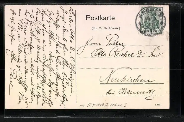 Personenbezogene Daten auf der Rückseite der Karte wurden durch blauen Textmarker unkenntlich gemacht. Die blauen Stellen sind auf die Vorderseite durchgeweicht und wirken sich negativ auf das Postkartenfoto aus