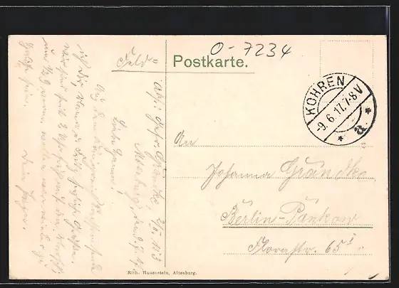 Personenbezogene Daten auf der Rückseite der Karte wurden durch blauen Textmarker unkenntlich gemacht. Die blauen Stellen sind auf die Vorderseite durchgeweicht und wirken sich negativ auf das Postkartenfoto aus