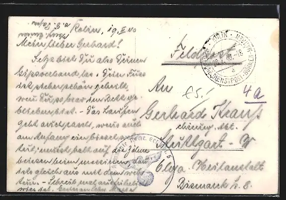 Personenbezogene Daten auf der Rückseite der Karte wurden durch blauen Textmarker unkenntlich gemacht. Die blauen Stellen sind auf die Vorderseite durchgeweicht und wirken sich negativ auf das Postkartenfoto aus