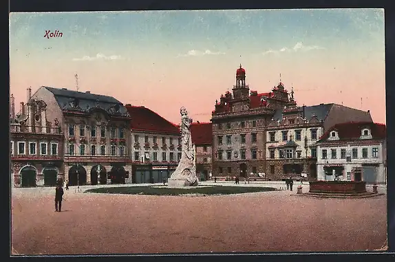 AK Kolin, Marktplatz mit Geschäften und Denkmal