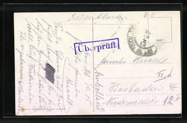 Personenbezogene Daten auf der Rückseite der Karte wurden durch blauen Textmarker unkenntlich gemacht. Die blauen Stellen sind auf die Vorderseite durchgeweicht und wirken sich negativ auf das Postkartenfoto aus