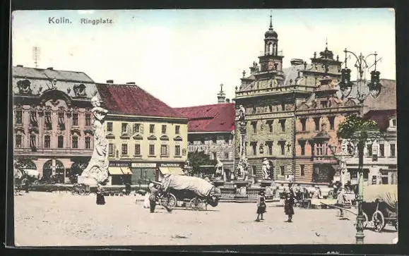 AK Kolin, Ringplatz mit Denkmal und Geschäften