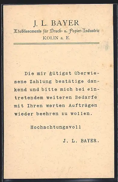 AK Kolin a. E., Druckerei und Papierherstellung J. L. Bayer