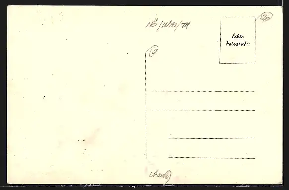 Personenbezogene Daten auf der Rückseite der Karte wurden durch blauen Textmarker unkenntlich gemacht. Die blauen Stellen sind auf die Vorderseite durchgeweicht und wirken sich negativ auf das Postkartenfoto aus