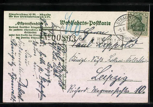 Personenbezogene Daten auf der Rückseite der Karte wurden durch blauen Textmarker unkenntlich gemacht. Die blauen Stellen sind auf die Vorderseite durchgeweicht und wirken sich negativ auf das Postkartenfoto aus