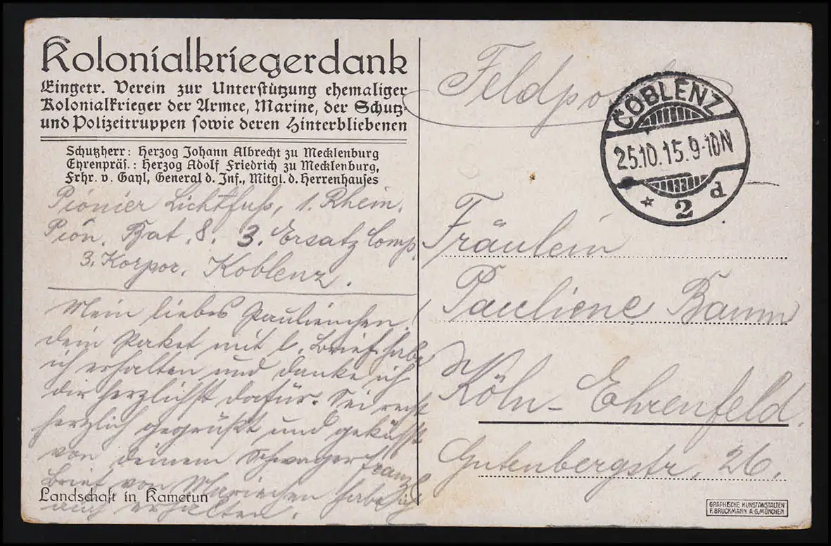 AK Kolonien Landschaft Kamerun Kolonialkriegerdank Feldpost COBLENZ 25.10.1915
