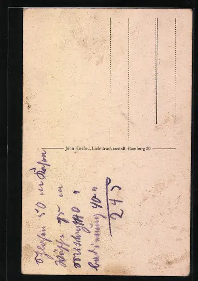 Personenbezogene Daten auf der Rückseite der Karte wurden durch blauen Textmarker unkenntlich gemacht. Die blauen Stellen sind auf die Vorderseite durchgeweicht und wirken sich negativ auf das Postkartenfoto aus
