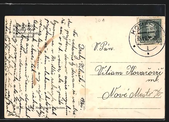 Personenbezogene Daten auf der Rückseite der Karte wurden durch blauen Textmarker unkenntlich gemacht. Die blauen Stellen sind auf die Vorderseite durchgeweicht und wirken sich negativ auf das Postkartenfoto aus