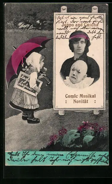 AK Komiker-Duo Juppo and Cascha, Portrait, Mädchen mit Schirm und Tafel