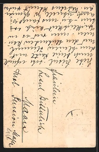 Personenbezogene Daten auf der Rückseite der Karte wurden durch blauen Textmarker unkenntlich gemacht. Die blauen Stellen sind auf die Vorderseite durchgeweicht und wirken sich negativ auf das Postkartenfoto aus