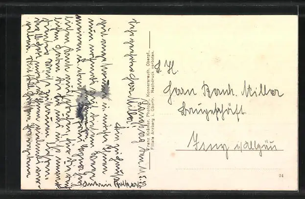 Personenbezogene Daten auf der Rückseite der Karte wurden durch blauen Textmarker unkenntlich gemacht. Die blauen Stellen sind auf die Vorderseite durchgeweicht und wirken sich negativ auf das Postkartenfoto aus