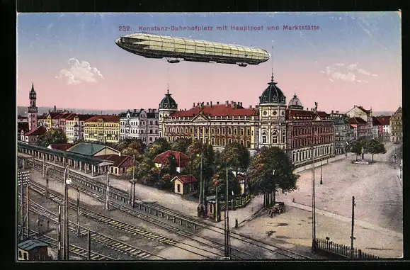 AK Konstanz-Bahnhofsplatz mit Hauptpost und Markstätte, Zeppelin