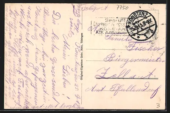 Personenbezogene Daten auf der Rückseite der Karte wurden durch blauen Textmarker unkenntlich gemacht. Die blauen Stellen sind auf die Vorderseite durchgeweicht und wirken sich negativ auf das Postkartenfoto aus