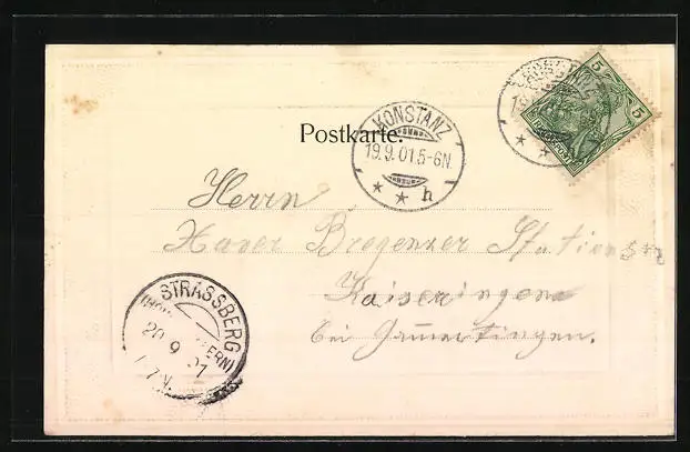 Personenbezogene Daten auf der Rückseite der Karte wurden durch blauen Textmarker unkenntlich gemacht. Die blauen Stellen sind auf die Vorderseite durchgeweicht und wirken sich negativ auf das Postkartenfoto aus