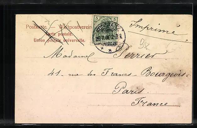 Personenbezogene Daten auf der Rückseite der Karte wurden durch blauen Textmarker unkenntlich gemacht. Die blauen Stellen sind auf die Vorderseite durchgeweicht und wirken sich negativ auf das Postkartenfoto aus