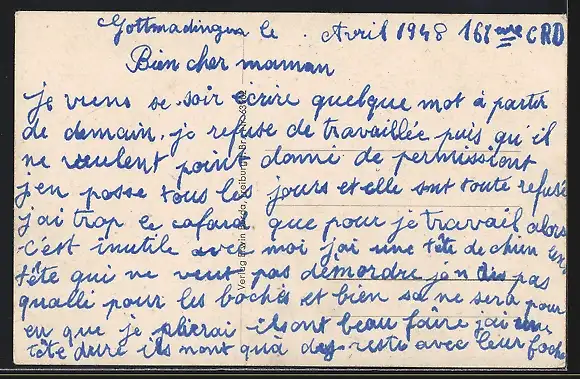 Personenbezogene Daten auf der Rückseite der Karte wurden durch blauen Textmarker unkenntlich gemacht. Die blauen Stellen sind auf die Vorderseite durchgeweicht und wirken sich negativ auf das Postkartenfoto aus