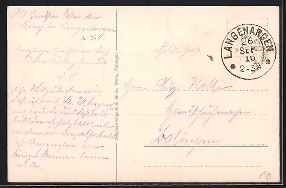 Personenbezogene Daten auf der Rückseite der Karte wurden durch blauen Textmarker unkenntlich gemacht. Die blauen Stellen sind auf die Vorderseite durchgeweicht und wirken sich negativ auf das Postkartenfoto aus