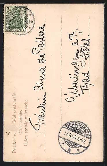alte Ansichtskarte, gelaufen 1905, rückseitig Oberflächenschaden, guter Zustand